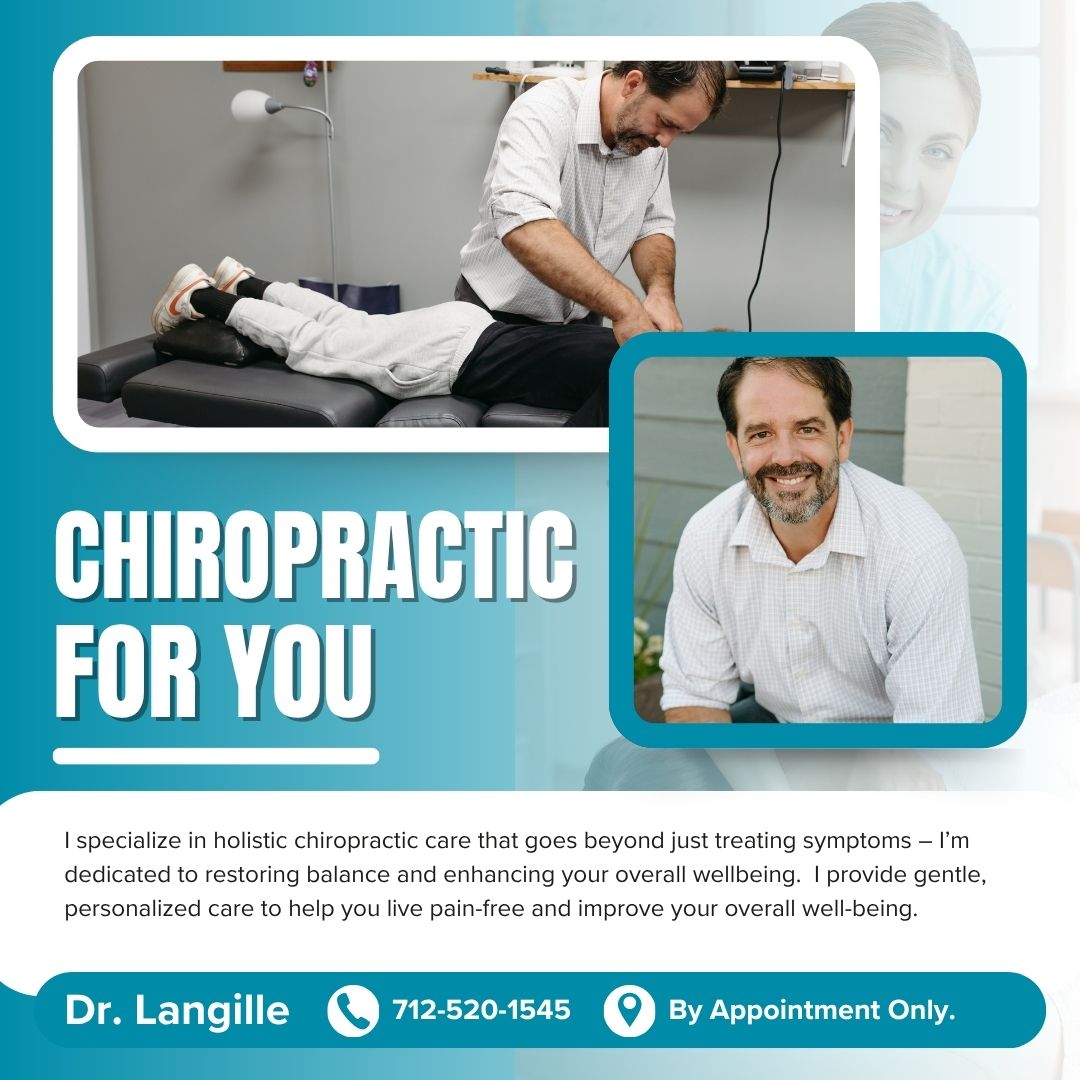 Call 712-520-1545 to schedule a chiropractic appointment with Dr. Langille.  He is by appointment only.