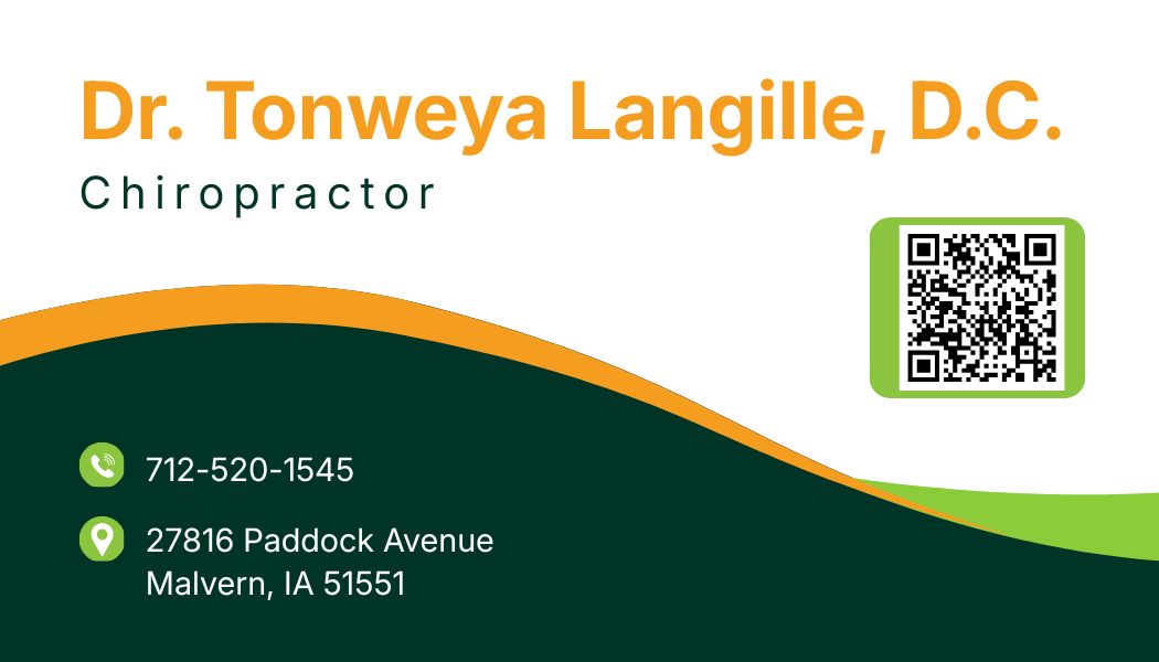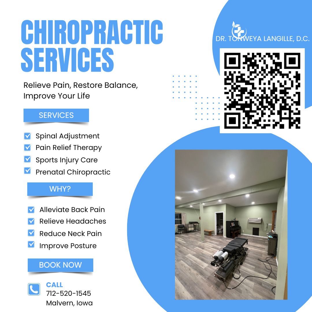 Dr. Tonweya Langille owned and operated Prairielands Chiropractic in Council Bluffs since he received his Doctorate from Palmer Davenport in 2007. He now works out of his home office, in Malvern, IA – just north of Tabor and between Glenwood, IA. “Growing up outside of Tabor on a family farm and returning to the area to serve has been a rewarding endeavor that completes an important circle for me; helping the people in a community which have shaped my family and I into who we are.” He and his teams of multiple providers have worked with patients of all ages and backgrounds including athletes of all levels as they try to reach various goals, PRs, and personal and health related accomplishments.